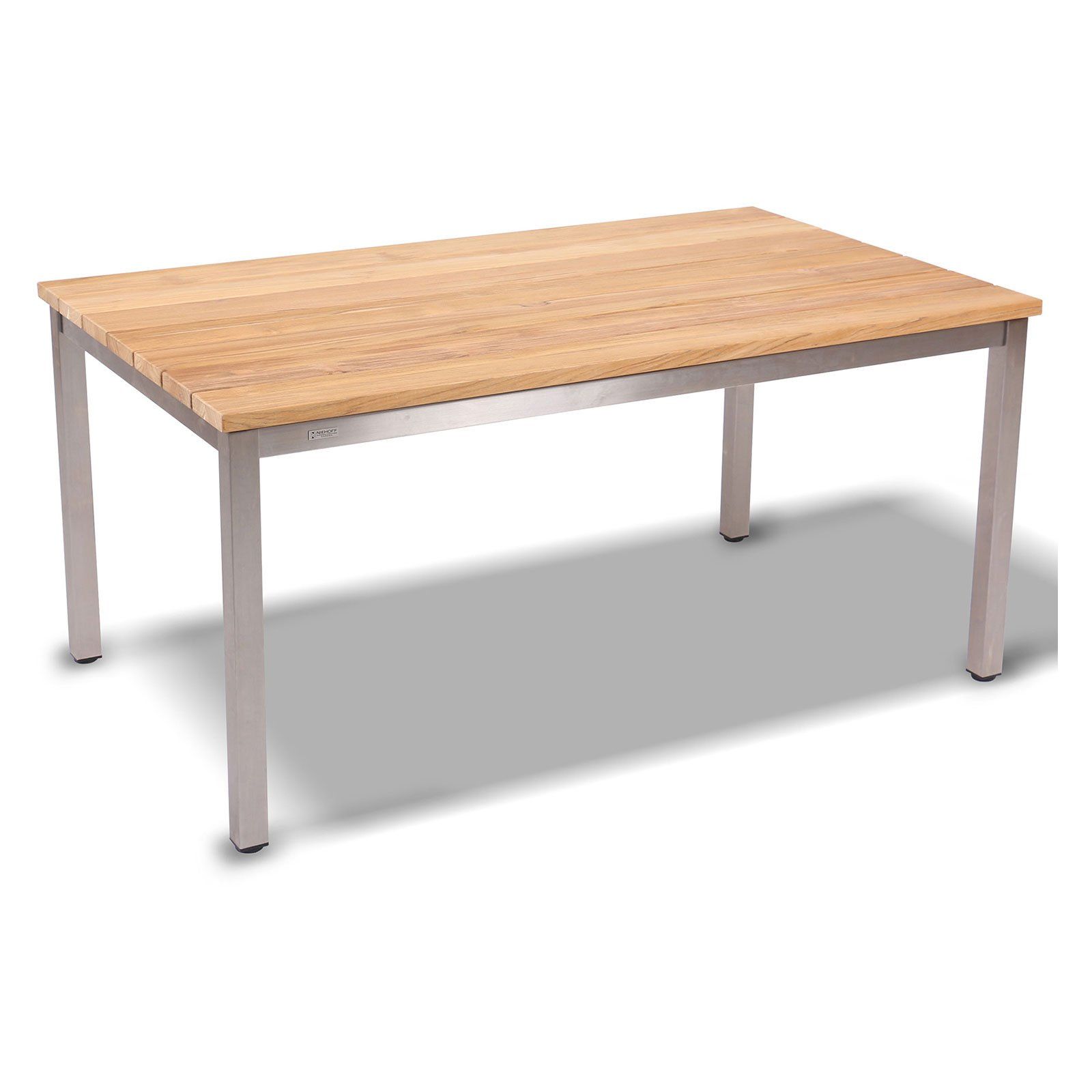 Der Tisch Nele sticht durch sein exklusives Design heraus. Gebürstetes, massives Premium Teakholz wurde für die 30 mm starke Tischplatte verwendet. Die Tischbeine und Zargen wurden in gebürstetem, rostfreiem Edelstahl angefertigt.